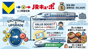 VポイントからJRキューポへは直接交換ができるため、九州の方にとっては「ウェル活」と並ぶ、あるいはそれ以上の「買い物ブースト術」と言えるでしょう。